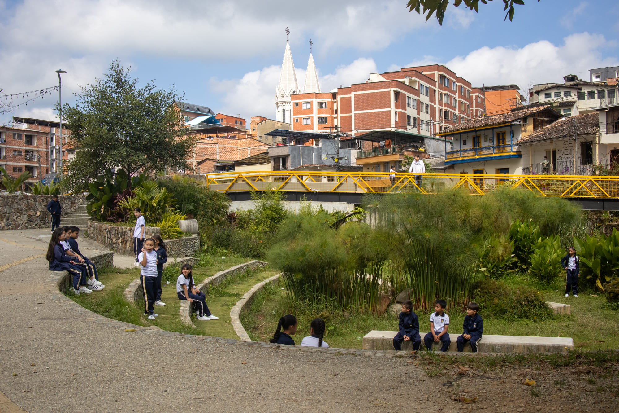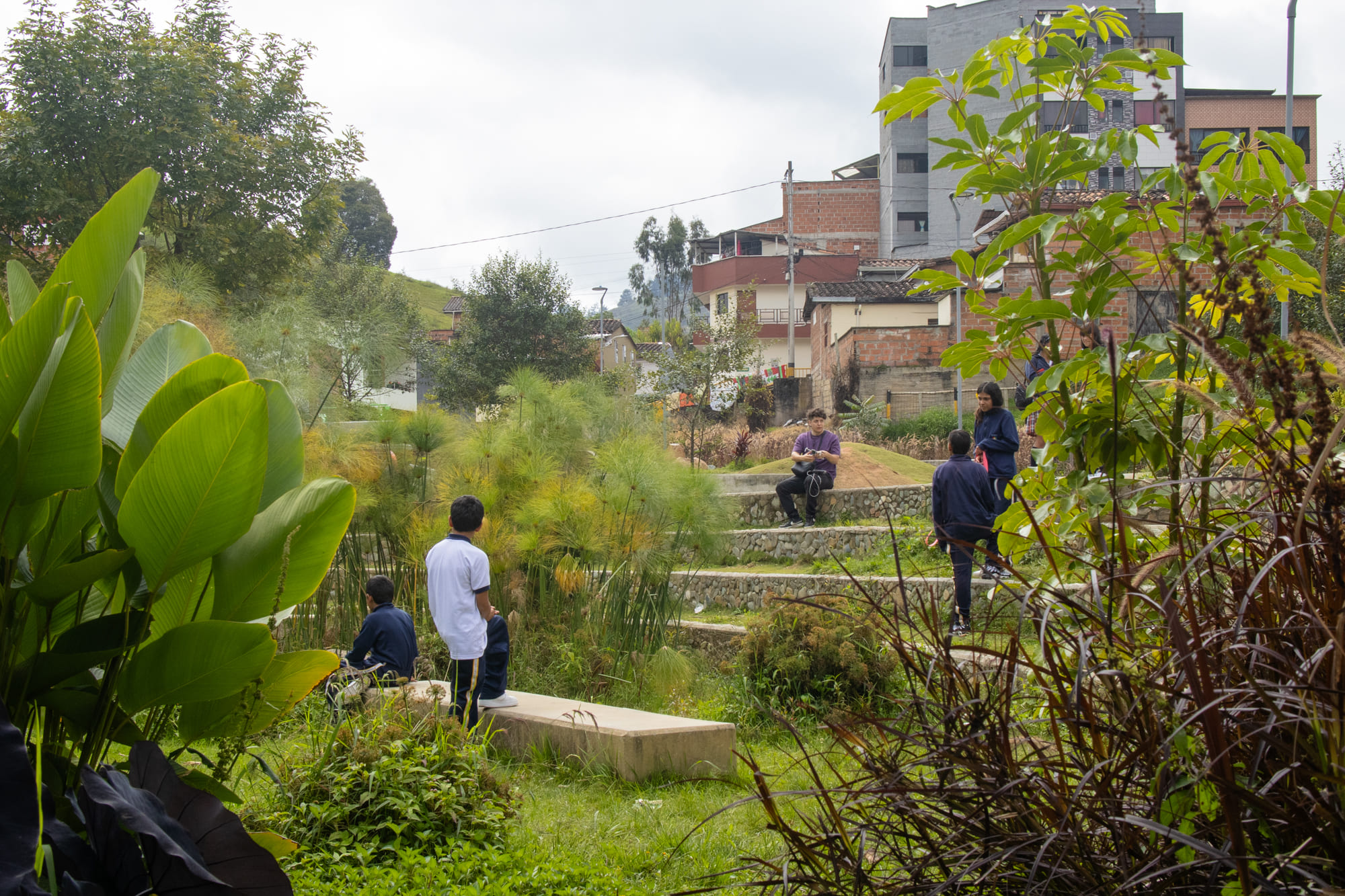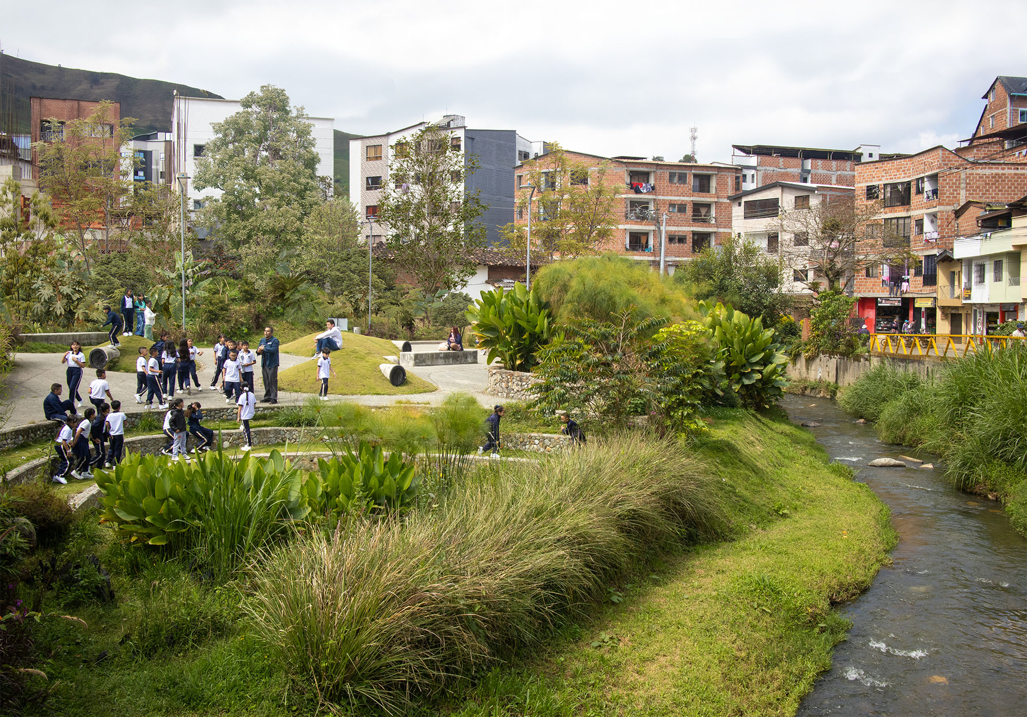 El proyecto surge como una respuesta estratégica para restablecer el equilibrio entre entornos urbanos y naturales. Ubicado en el corredor biológico de la quebrada, el proyecto implementa técnicas innovadoras que facilitan la permeabilidad y conducción del agua de escorrentía, generando una interacción armónica entre infraestructura y ecosistemas.