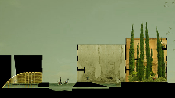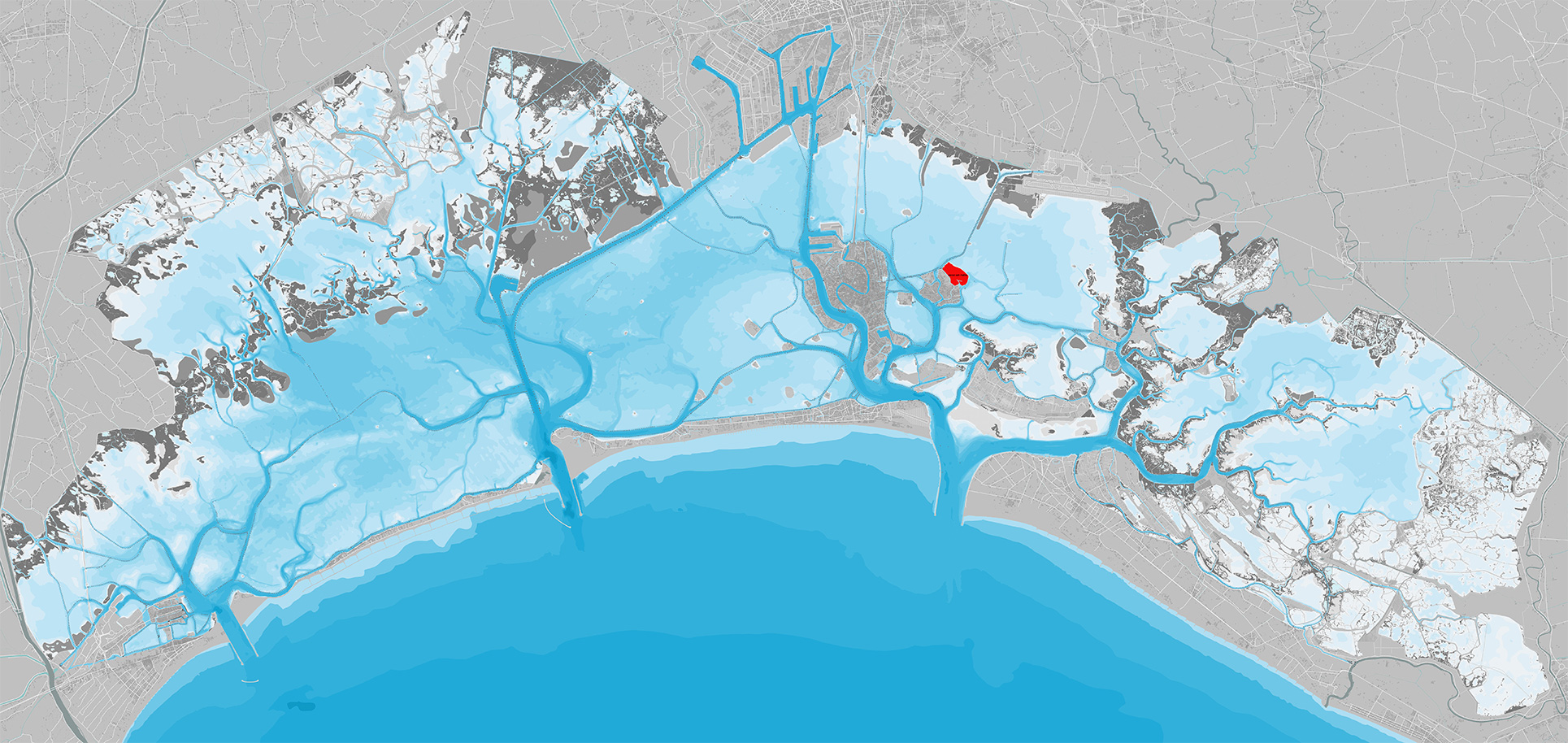 La laguna de Venecia es colonizada por un sistema de arrecifes artificiales que pretende recuperar, mantener y proteger un fértil sistema vivo vegetal y animal. Con el cambio de las mareas este arrecife emerge o desparece parcialmente.