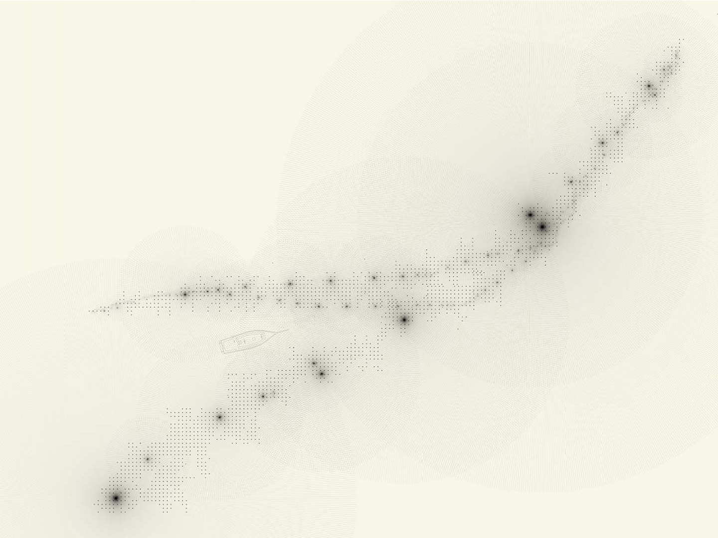 Las costas de la isla son su sistema de circulación principal; sin senderos; sin programa. Aparecen trazos y resguardos para hacer que lo ya existente emerja.