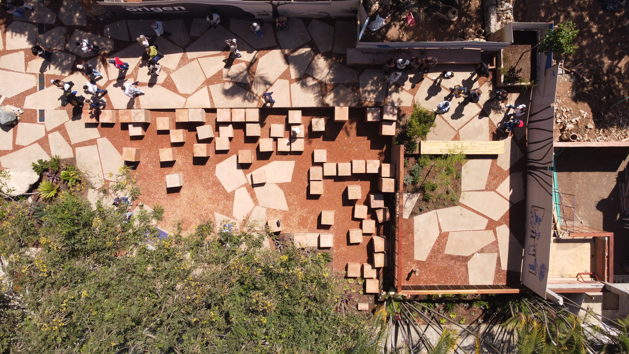 El concreto del proyecto refleja la materialidad preexistente y preserva la memoria del edificio mediante el uso de agregados finos y gruesos obtenidos del triturado de ladrillos, baldosas y concretos de la demolición.