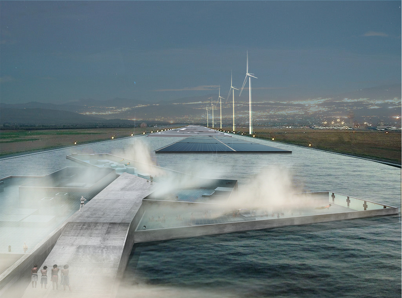 “La propuesta yuxtapone la reflectividad y la infinidad de las piscinas que se extienden hacia el horizonte de un campo de aviación abandonado, con las relucientes superficies metálicas de los aviones que una vez ocuparon este lugar. En contraste con la luz brillante y el azul claro de Quito, su proyecto para la Laguna de Venecia se sumerge en las turbias profundidades impenetrables de una Venecia fría, húmeda y oscura. En ambos ejemplos las cualidades fenomenológicas particulares y la experiencia de sitio se muestran a través del más fundamental de sus componentes, el agua. Igualmente, estos proyectos exploran las condiciones asociadas a la experiencia de la fecunda humedad o la luminosa aridez, y construyen espacios públicos plenos a través de condiciones ambientales y atmosféricas establecidas por el agua en sus diversos estados”